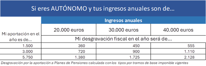 En la siguiente tabla Inverco ha calculado la desgravación fiscal a la que puede acogerse un trabajador autónomo, según las aportaciones realizadas a Planes de Pensiones, según los tipos de gravamen vigentes por tramos de ingresos e importe aportado a Planes. Como ejemplo: