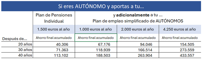- En el caso de un trabajador autónomo que ahorrase 1.500 euros anuales en PPI y otros 1.000 euros a un PPES, durante 20 años, podría acumular un ahorro de 67.176 euros al finalizar ese periodo, una cuantía que puede elevarse hasta los 188.503 euros, si mantiene esa misma aportación durante un periodo de 40 años.